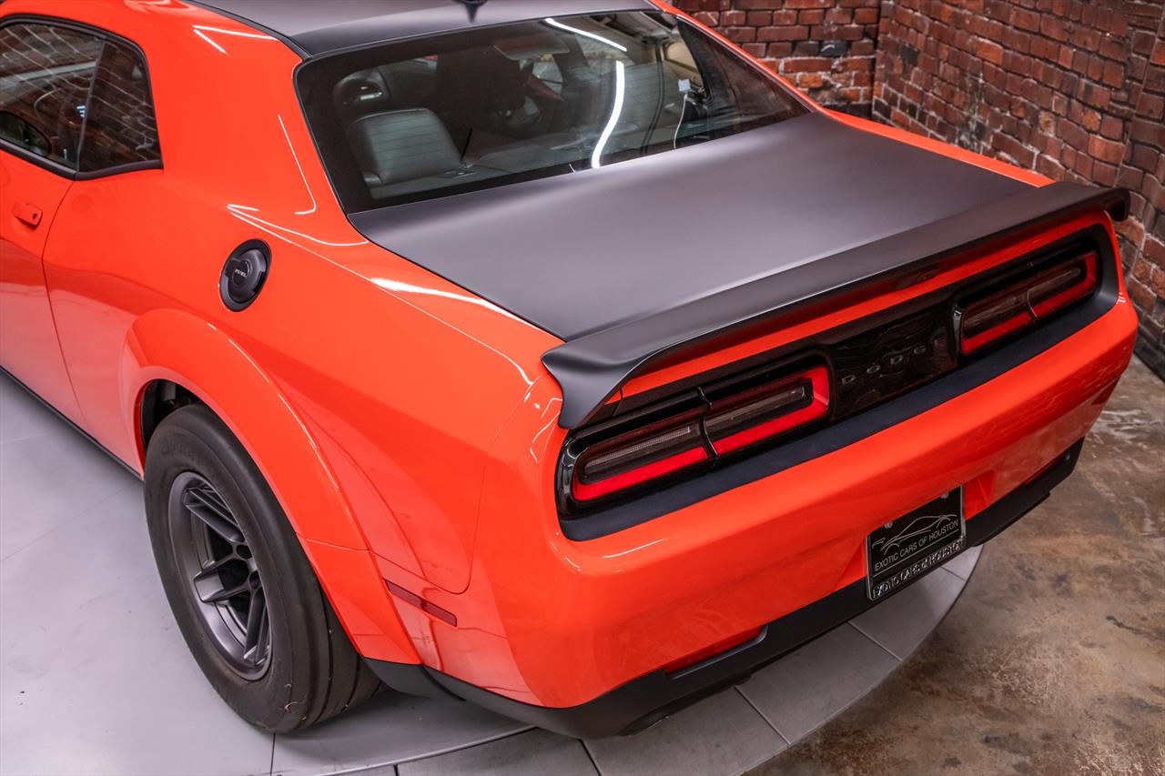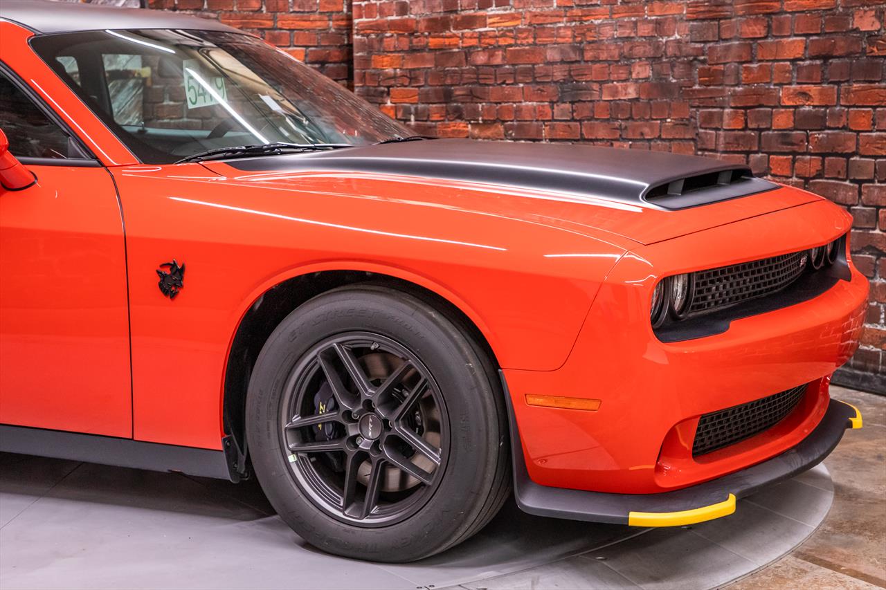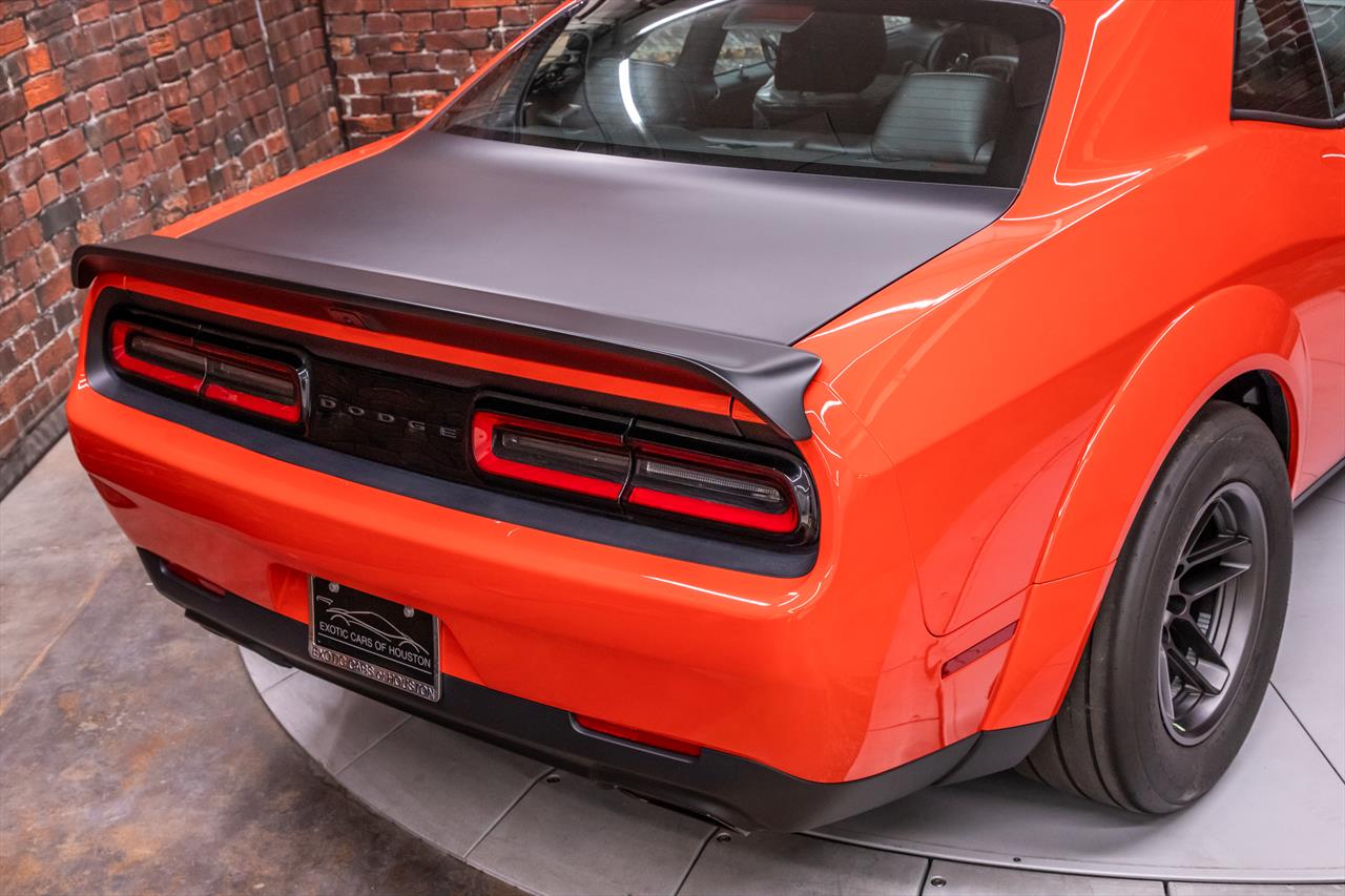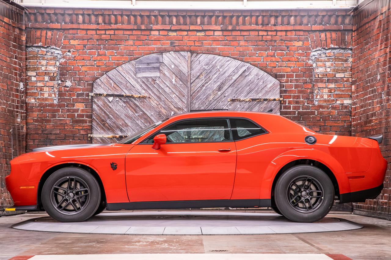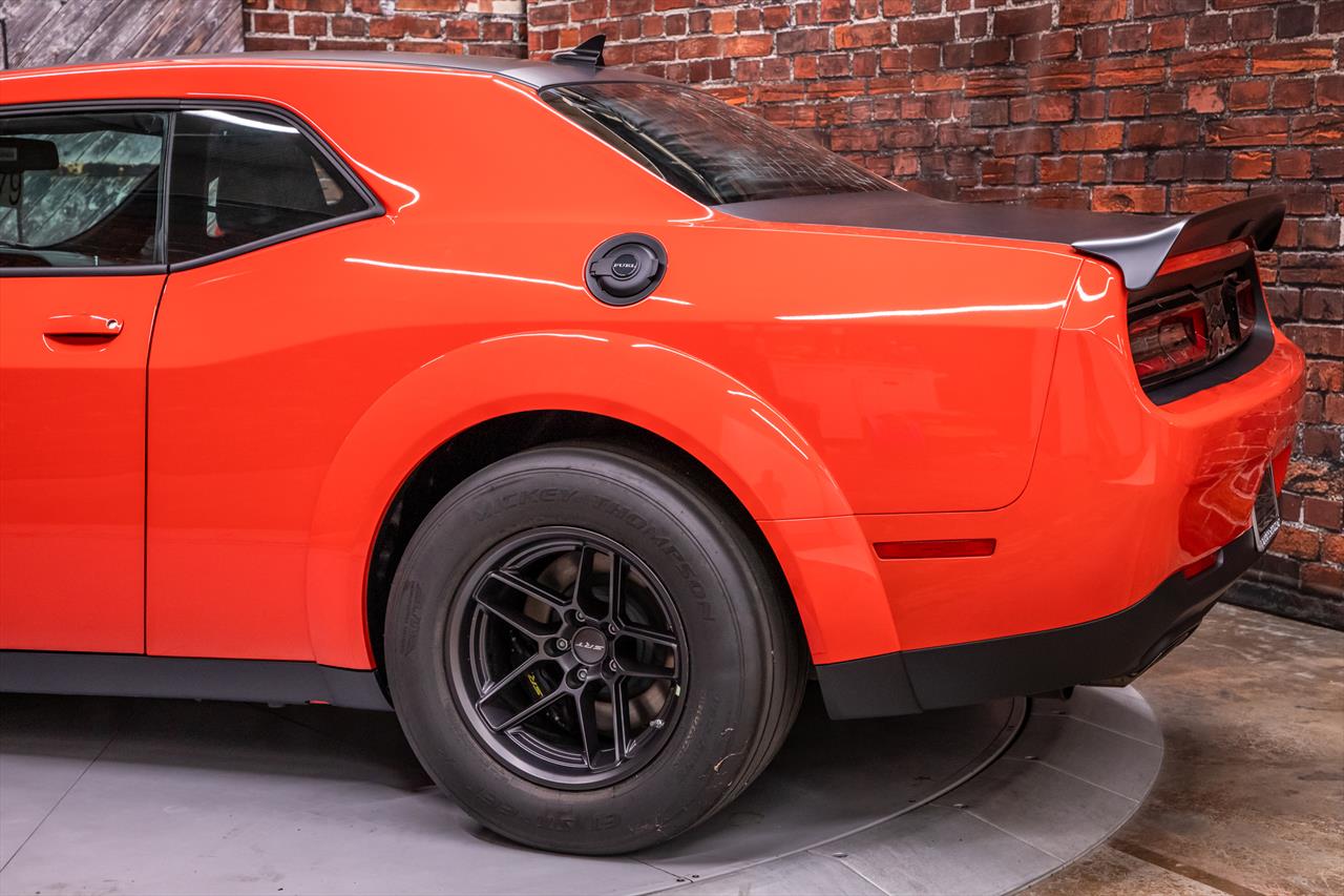 New Dodge Challenger SRT Demon 170 in Go Mango exterior with only 31 miles. The Demon 170 has a supercharged 6.2L Hemi V8 that produces 1,025 horsepower and 945 lb-ft of torque on E85 through an automatic transmission.