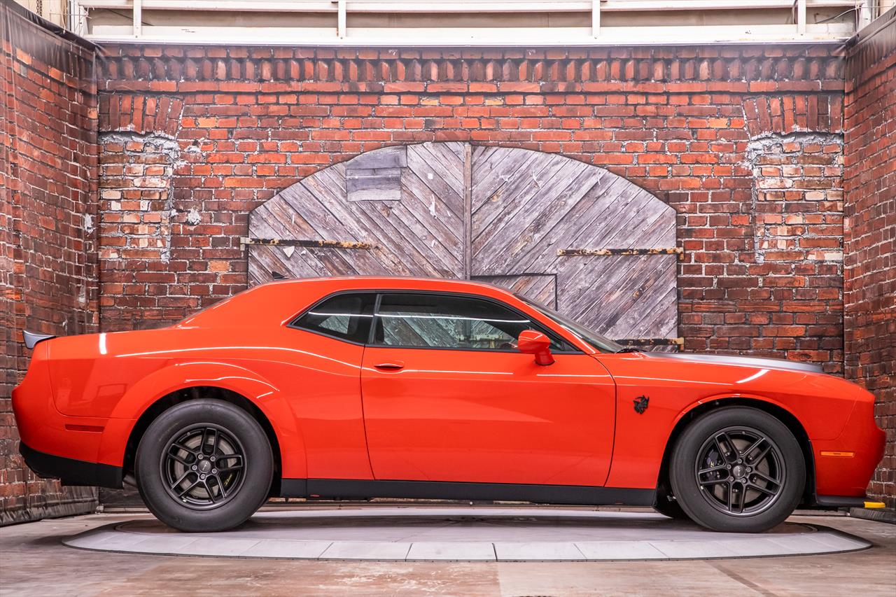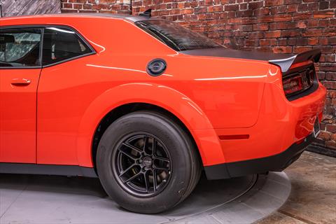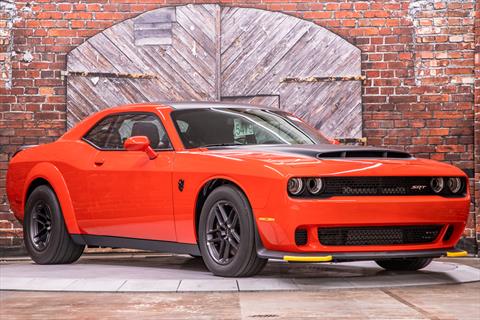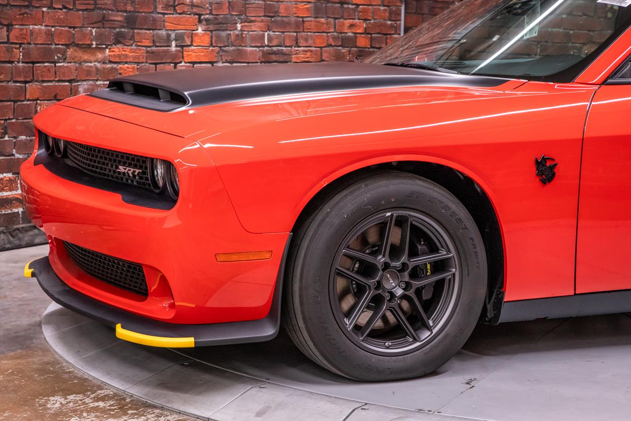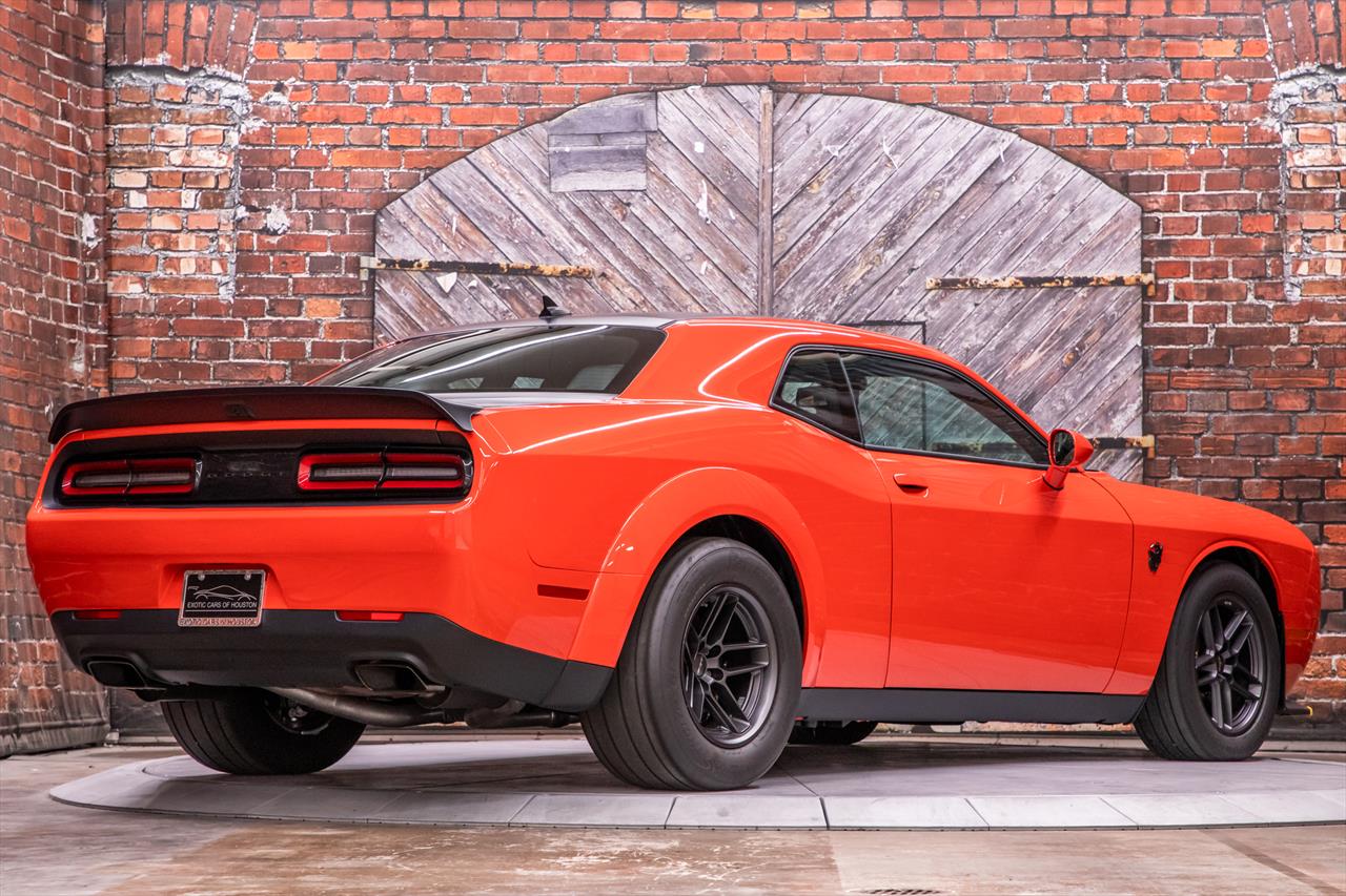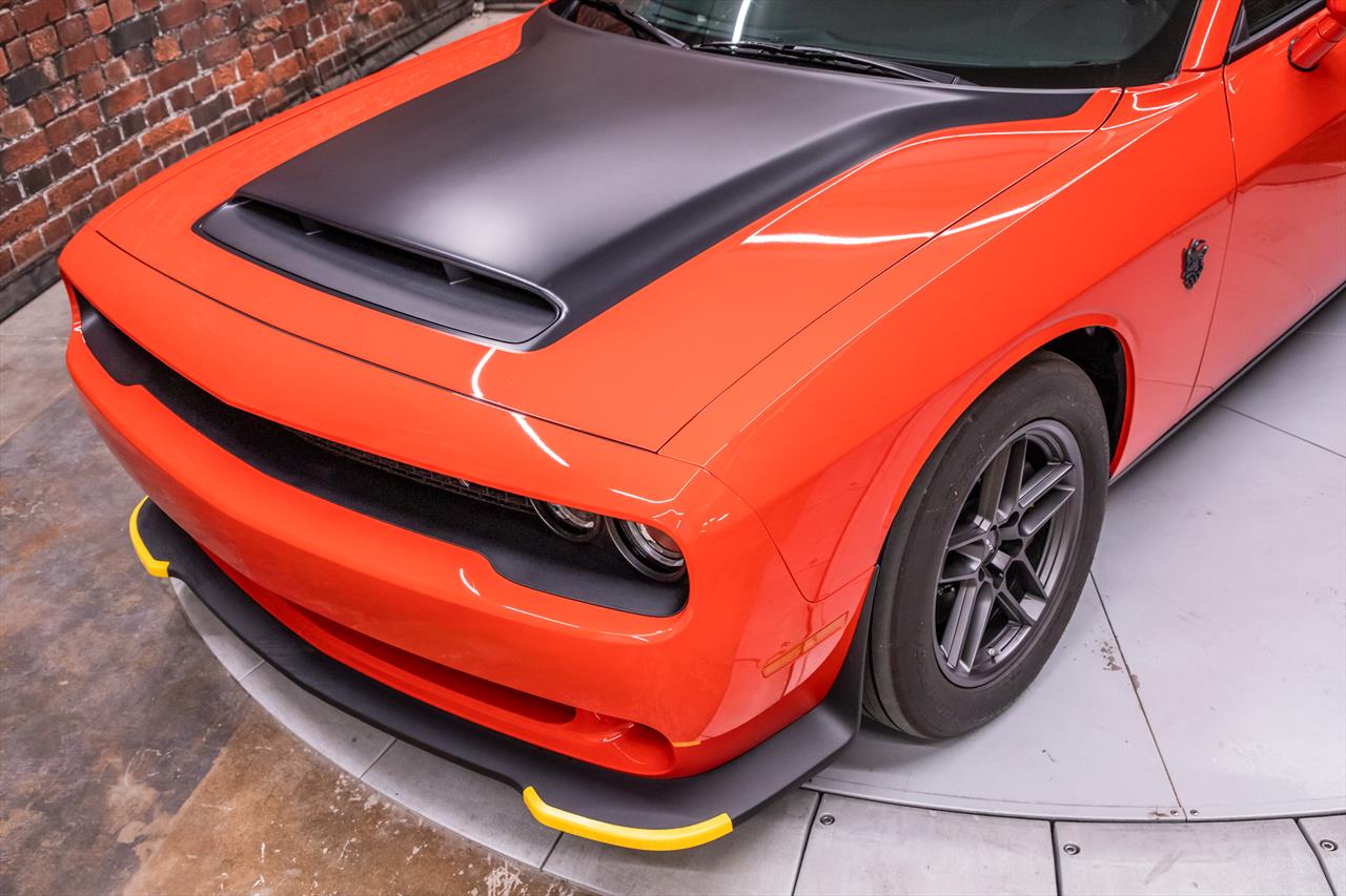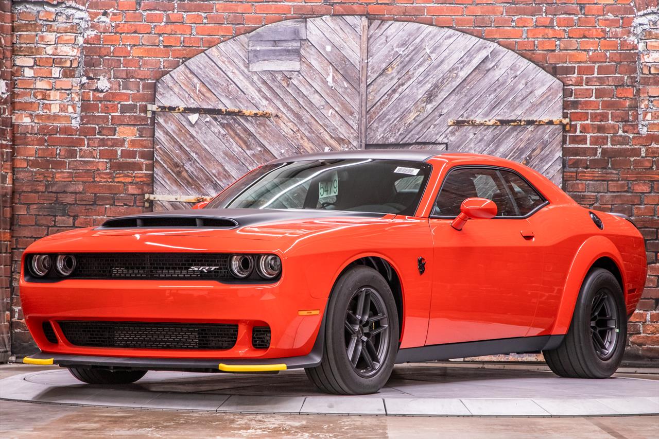 New Dodge Challenger SRT Demon 170 in Go Mango exterior with only 31 miles. The Demon 170 has a supercharged 6.2L Hemi V8 that produces 1,025 horsepower and 945 lb-ft of torque on E85 through an automatic transmission.