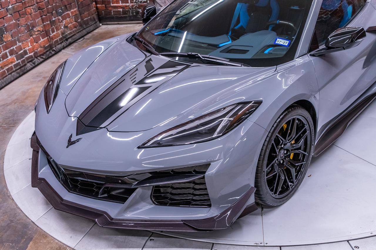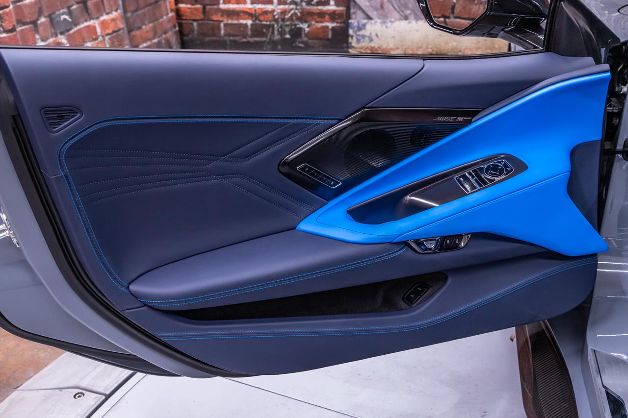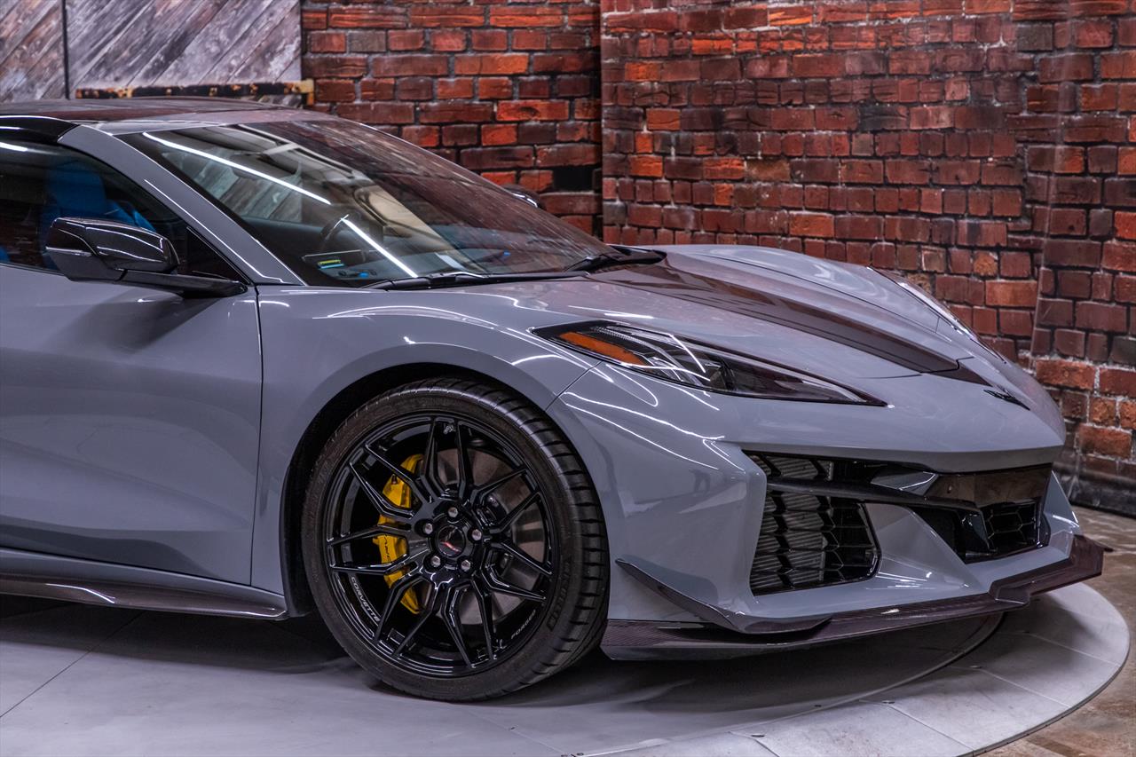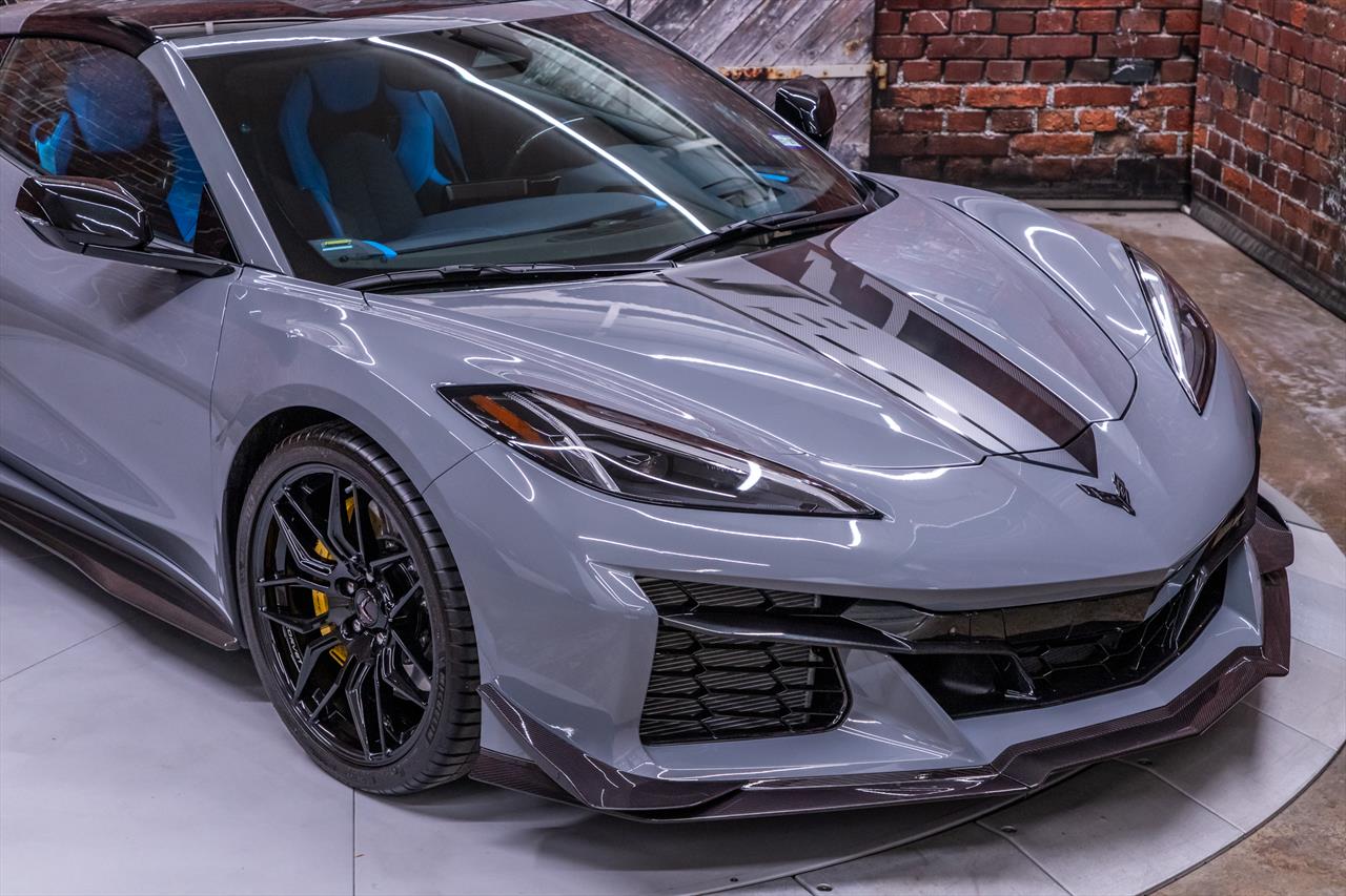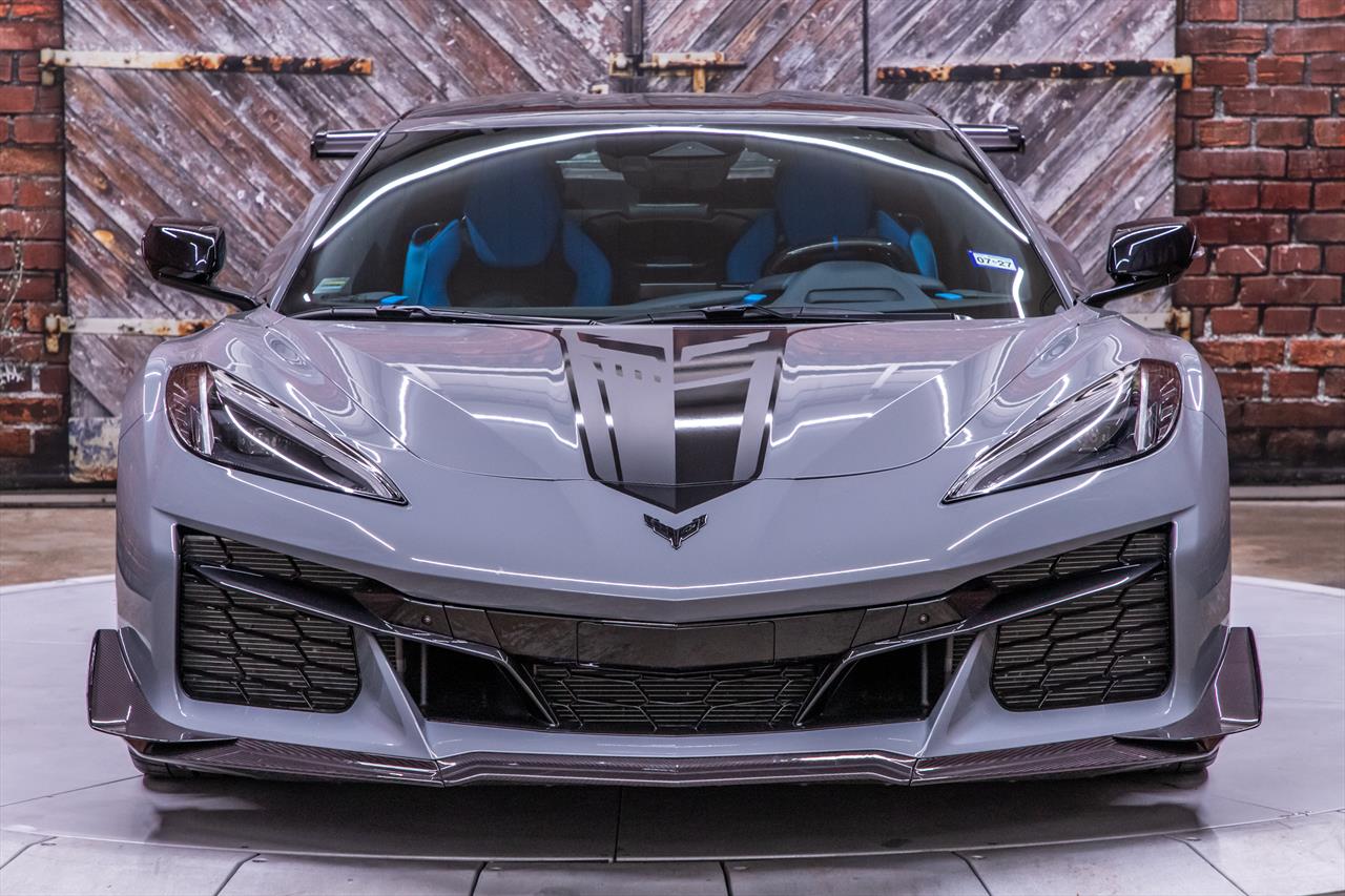For sale is a 2025 Corvette Z06 3LZ with only 764 miles finished in Sea Wolf Grey Tricoat exterior with Tension/Twilight Blue leather interior. The C8 Z06 features a flat plane crank 5.5L v8 producing 670hp and 460 lb-ft of torque through a Tremec 8-speed dual clutch transmission.