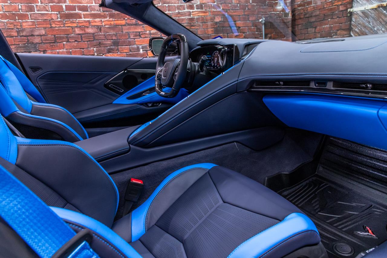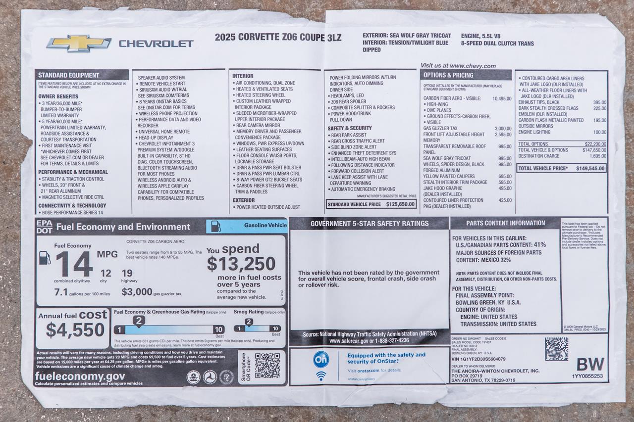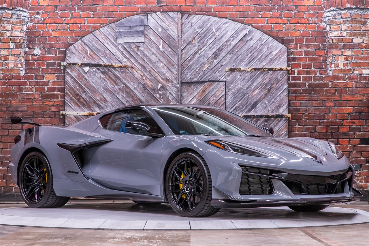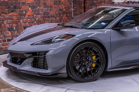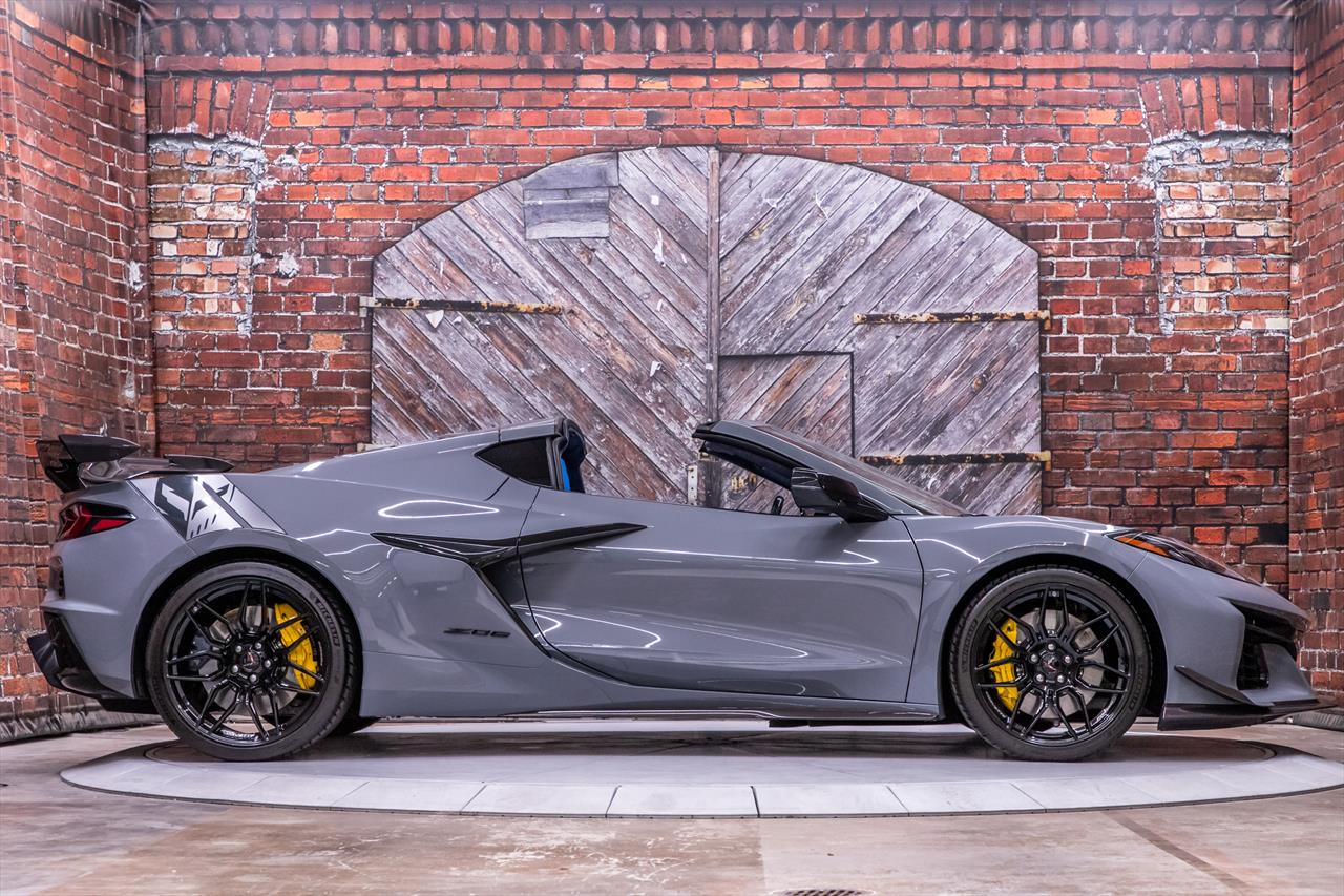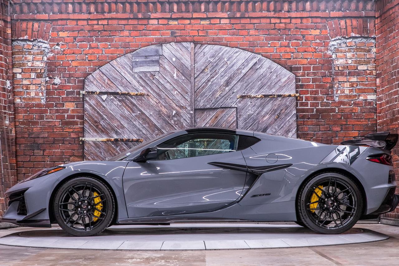For sale is a 2025 Corvette Z06 3LZ with only 764 miles finished in Sea Wolf Grey Tricoat exterior with Tension/Twilight Blue leather interior. The C8 Z06 features a flat plane crank 5.5L v8 producing 670hp and 460 lb-ft of torque through a Tremec 8-speed dual clutch transmission.