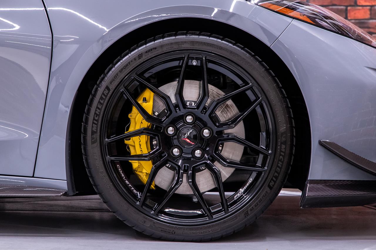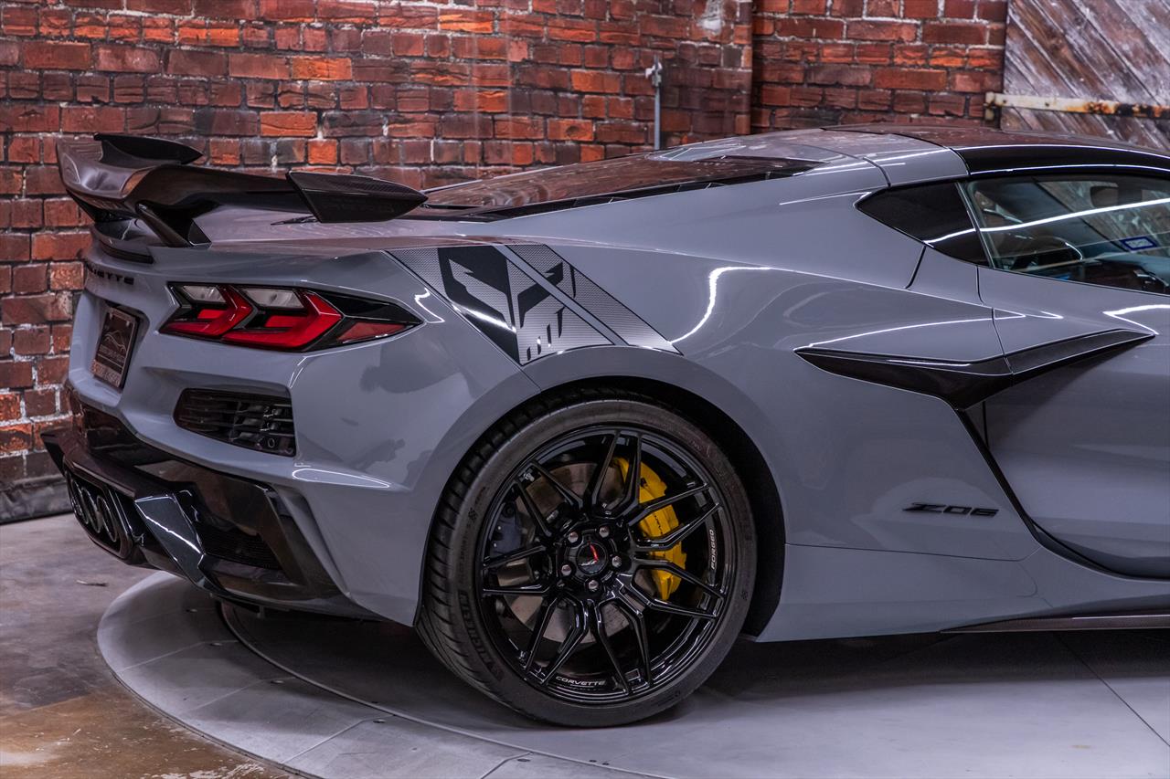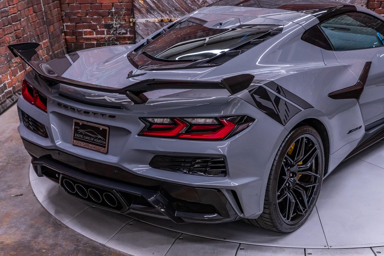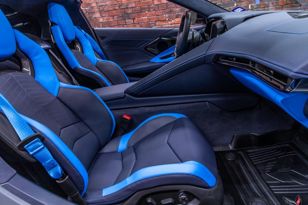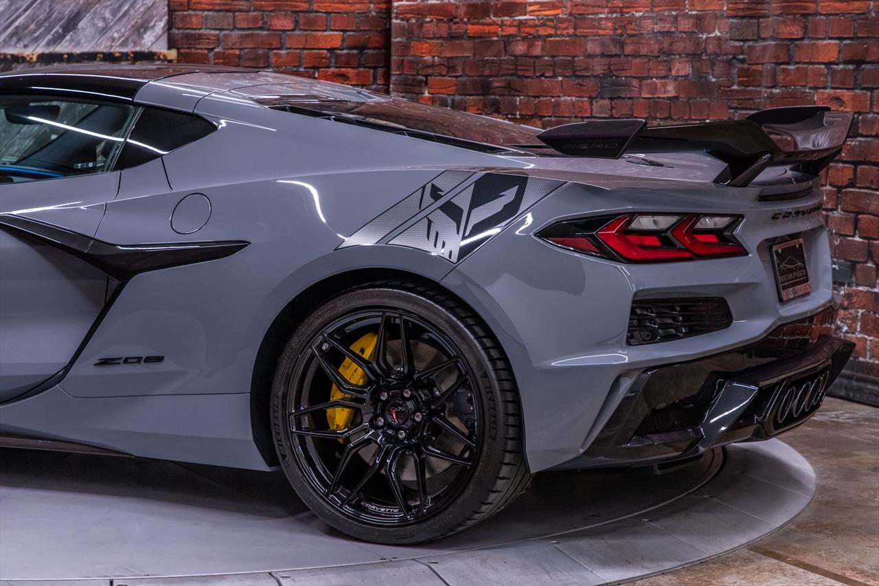 For sale is a 2025 Corvette Z06 3LZ with only 764 miles finished in Sea Wolf Grey Tricoat exterior with Tension/Twilight Blue leather interior. The C8 Z06 features a flat plane crank 5.5L v8 producing 670hp and 460 lb-ft of torque through a Tremec 8-speed dual clutch transmission.